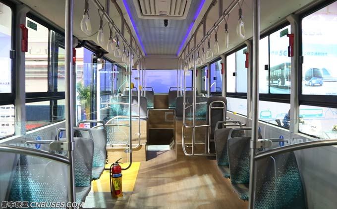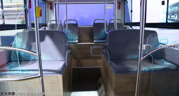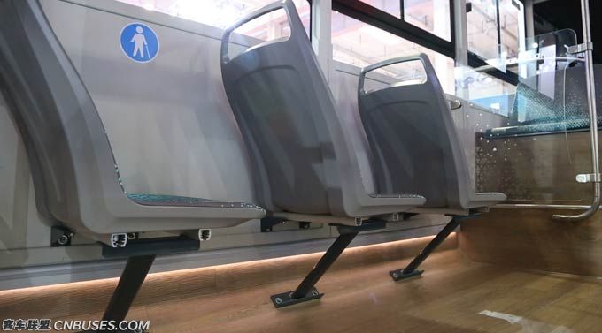 乘客座椅同样也是专门定做,可以看到中部乘客座椅采用了斜撑式的椅子角,这样既可以让车内空间更开阔,视觉更好,同时也充分照顾到了公交车日常维护保养便利性。