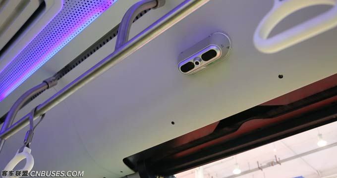 再看每个车门上面,我们可以看到一个类似机器人眼睛,那就是前面提到的客流计数器,在前后门上都有装,方便对乘客上下车进行统计。通过这个数据,公交公司也可以很快掌握各条线路乘客上座率、各个时间段客流量等数据,更精准把握线路的运营数据。
