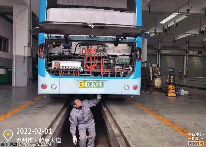 苏州园区公交车在维修点进行维护作业
