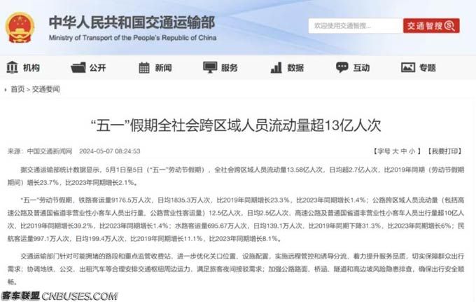在社交平台上,“每个城市都来了1亿人”“游客攻占多个旅游城市”等话题持续霸榜。全国道路客流量快速攀升,多地开启“高峰迎客”模式。据交通运输部数据显示,全国公路跨区域人员流动量124977万人次,日均24995.4万人次,比2023年同期增长2.1%。其中,公路营业性客运量17385万人次,日均3477万人次,比2023年同期增长6.5%。