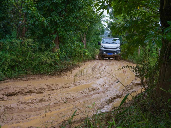 从鸡窝坑脱困而出,经过一段小树林,就来到第二个关卡——交叉轴路段。对拥有全时四驱+三把锁的依维柯欧霸·山海来说,想要通过这一关,其实并不困难,只需在低速四驱模式下锁止中央差速锁,万一遇到单侧后轮打滑的情况也没关系,只要启用后桥差速锁,让两个后轮同步转动,获得相同扭矩,一样可以轻松脱困。