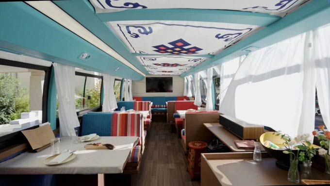步入E12S内部,一层为多功能服务区,设有卫生间、文创展示和厨师操作等区域。二层为就餐区,氛围温馨雅致。车厢内还设有专业影音系统与专属演艺区域,可为游客呈现精彩民俗表演。更令人安心的是,车辆特别配备了制氧系统,让旅客无惧高原反应,尽兴享用美食,观赏美景。