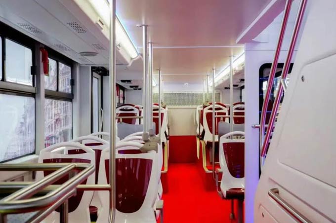本次进阶的第四代纯电动敞篷双层观光巴士E12S,外观采用E系列新前脸,搭配典雅灯具与电镀饰件,更具科技感;整车通过轴距加长与底盘优化,实现上层50座、下层22+1座的宽敞布局。驾驶区配备一体化可调节平台与10.1英寸智能大屏,操作便捷;乘客区设有USB充电口、多国语音导览及无障碍设施,提升舒适与人性化体验。