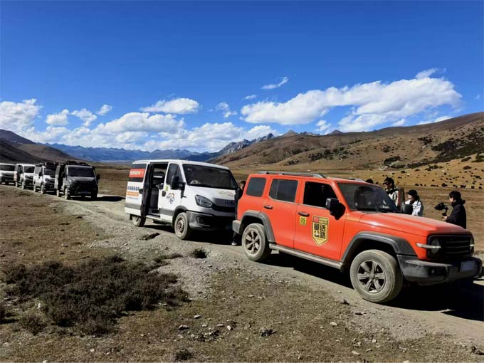 当车辆驶过塔公草原的高原土路,全时四驱系统与全地形轮胎稳抓地面,氮气减震器过滤颠簸,车身始终保持稳健姿态;加装涉水喉的车辆,穿越涉水浅滩毫无波澜,轻松通过。