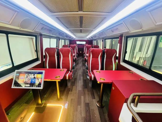 在内部空间设计上,E12S同样匠心独运,精准回应乘客多元需求。一层空间特设公交主题文创展柜,荟萃承载太原城市记忆的特色文创,让地域文化在方寸之间绽放独特魅力;二层采用卡座式散座布局,搭配高档真皮座椅,营造出惬意舒适观景氛围。