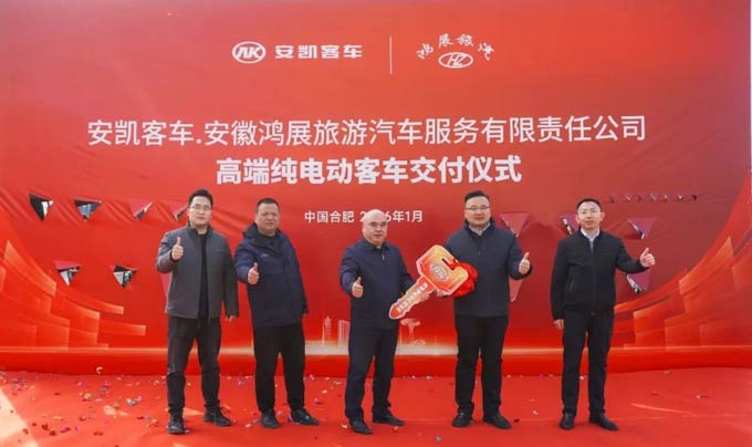 共筑绿色运力,助推客运升级!2026年1月6日,批量安凯N12E与N11E纯电动客车,正式加入安徽鸿展旅游汽车服务有限责任公司(以下简称“安徽鸿展”)的运营矩阵。此次交付既是双方多年合作的崭新篇章,也是绿色出行理念的深度践行。这批高品质新能源客车,将助力安徽鸿展提升服务能级、开拓市场新境,也为区域旅游客运绿色转型注入强劲动力。