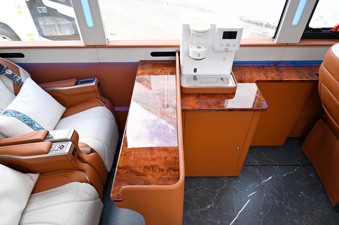 在为乘客提供便捷服务方面,“海格公路和谐号”同样表现卓越。智能即热饮水机能够按照乘客需求快速提供多温饮用水,让乘客时刻保持充沛精力;精心设置的无线充电区域,摆脱线缆束缚,高效充电保障设备续航;内置的高品质冰箱能够储备新鲜饮食,满足乘客多样化的口味需求;此外,“海格公路和谐号”上雨伞等贴心小物也一应俱全,随时应对天气变化,细微之处彰显人文关怀。