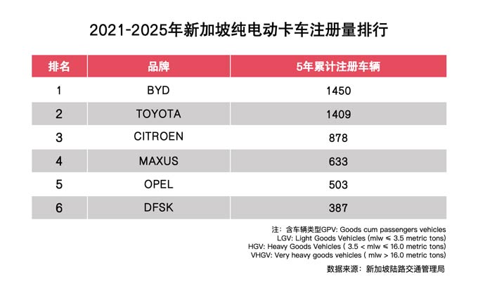 在电动卡车领域,比亚迪于2020年进入新加坡,开始向当地正式交付环卫车T9.成为当地第一家销售电动卡车的公司。2021年-2025年,比亚迪纯电卡车在新加坡五年累计注册量达1450台,排行第一。