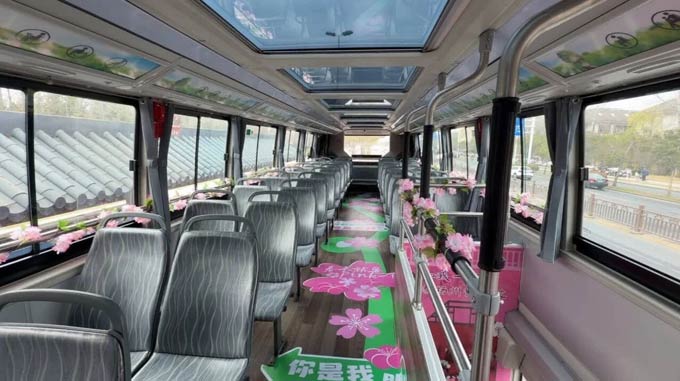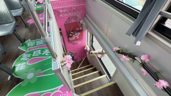 走近这辆苏州金龙双层巴士,第一眼便被其外观设计深深吸引。车身以樱花粉为底色,配以细腻的花瓣图案、“与你邂逅樱花间”的暖心标语,行驶于绿树与花海之间,宛如一张会移动的城市明信片。车内同样用心打造:车内扶手、两侧车窗贴合樱花主题装饰,抬眼望去满是浪漫气息;配套的鉴真路公交站台也经过主题改造,粉白相间的站台与路边盛放的樱花浑然一体,候车本身就成了赏景的一部分。